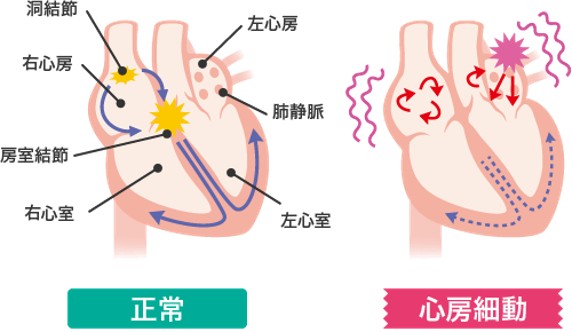心房細動の怖い点は、心房の全体的な動きが悪くなることにより、心房内に血液が停滞し、血の塊である「血栓」が作られやすくなることです。