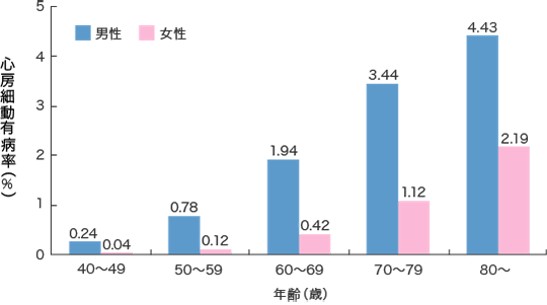 日本人を対象とした疫学研究で、高齢になるほど心房細動の起こる頻度(心房細動有病率)が上がること、男性の方が女性よりも有病率が高いことがわかっています(図3)。