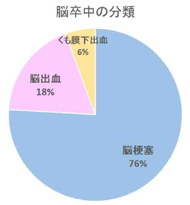脳卒中には脳梗塞、脳出血、くも膜下出血がありますが、脳卒中データバンクによる統計では、脳梗塞が76%と圧倒的に多く、次に脳出血が18.5%、くも膜下出血が5.6%です(図4)。