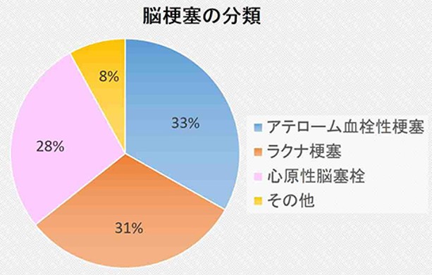 脳梗塞には前掲の3つのタイプがありますが、それぞれの発症頻度は、アテローム血栓性脳梗塞33%、ラクナ梗塞31%、心原性脳塞栓症28%、その他の脳梗塞8%と報告されています(図5)。