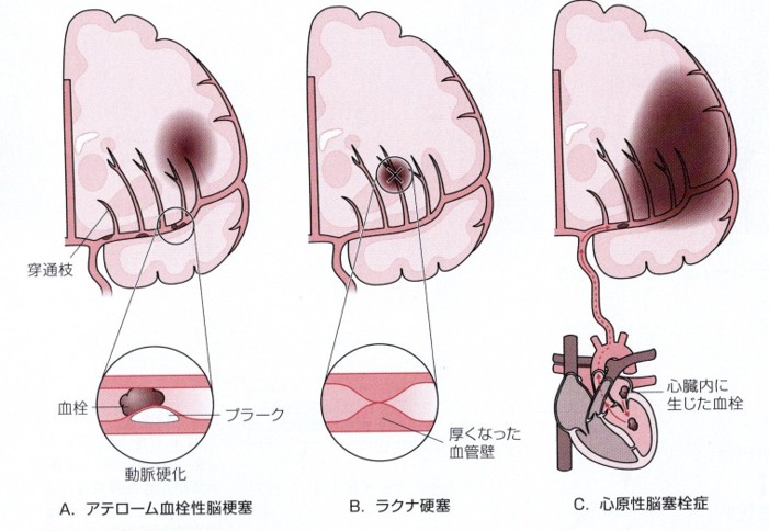 脳梗塞には主にアテローム血栓性脳梗塞、ラクナ梗塞、心原性脳塞栓症の3つのタイプがあります(図1)。長嶋さんが患ったのは心原性脳塞栓症です。これは不整脈の一つである「心房細動」に起因して発症します。
